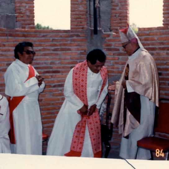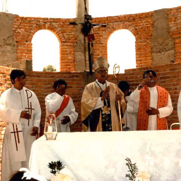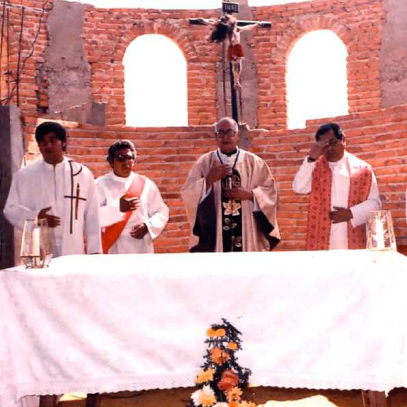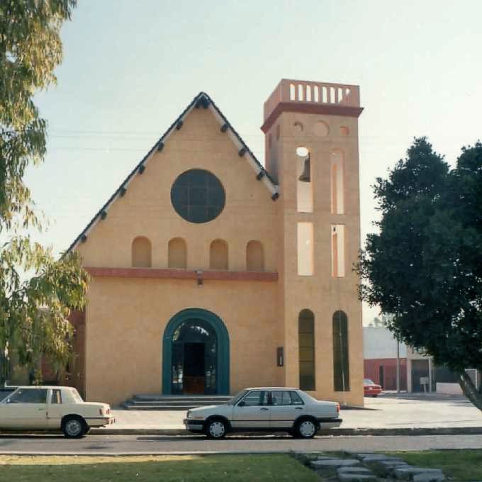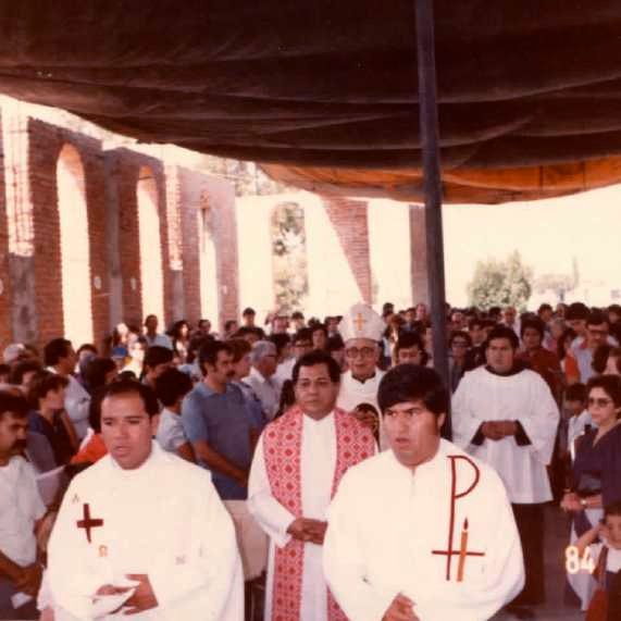 Gracias al esfuerzo de todos, el 10 de octubre de 1982, el Excmo. y Rvdmo. Sr. Dr. D. Alfonso Toriz Cobián colocó y bendijo la primera piedra del templo parroquial, acto promovido naturalmente por el P. Manuel Malagón... Había efervescencia e ilusión. Poco tiempo después ya se tenían iniciados los muros de la Iglesia, y se instaló un techo provisional -de lámina-; así se comenzó a celebrar una Misa dominical a las 18:00 Hrs.